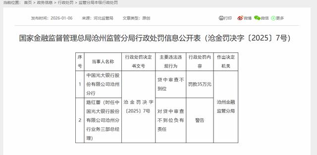 同日,国家金融监督管理总局沧州监管分局行政处罚信息公开表(沧金罚决字〔2025〕7号)显示,中国光大银行股份有限公司沧州分行,因“贷中审查不到位”,沧州金融监管分局对其罚款35万元。