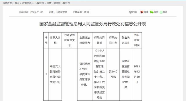2026年1月6日,国家金融监督管理总局大同监管分局行政处罚信息公开表(同金管罚决字〔2025〕45号)显示,中国光大银行股份有限公司大同分行,因“贷后管理不到位;福费廷业务管理不审慎”,国家金融监督管理总局大同监管分局于2025年12月30日对其作出罚款40万元的行政处罚。