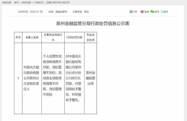 同一天,泉州金融监管分局行政处罚信息公示表显示,中国光大银行股份有限公司泉州分行及相关责任人,因“个人经营性贷款贷前调查不尽职、贷后管理不到位;流动资金贷款贷前调查不尽职、贷后管理不到位”,泉州金融监管分局对中国光大银行股份有限公司泉州分行合计处以120万元罚款,对蔡某某给予警告,对吴某给予警告。