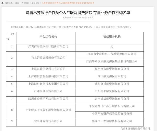 此前,乌鲁木齐银行曾公告称,停止合作类个人互联网消费贷款业务。