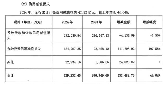 2022年至2024年三年间,华润银行共计提了93.44亿元信用减值损失。细分来看,2024年华润银行金融投资信用减值损失13.43亿元,同比增幅高达497.58%。
