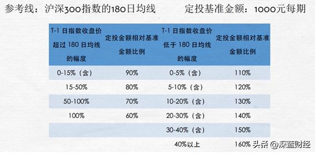 例如,在约定扣款日的上一交易日,若沪深300指数收盘价比180日均线高出5%,则此期定投金额将减少10%至900元;若沪深300指数收盘价比180日均线低5%,则此期定投金额将增加10%至1100元。