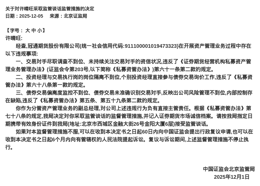 蓝鲸新闻12月5日讯,近日,中国证监会北京监管局发布了行政监管措施决定书,剑指冠通期货股份有限公司及相关责任人。