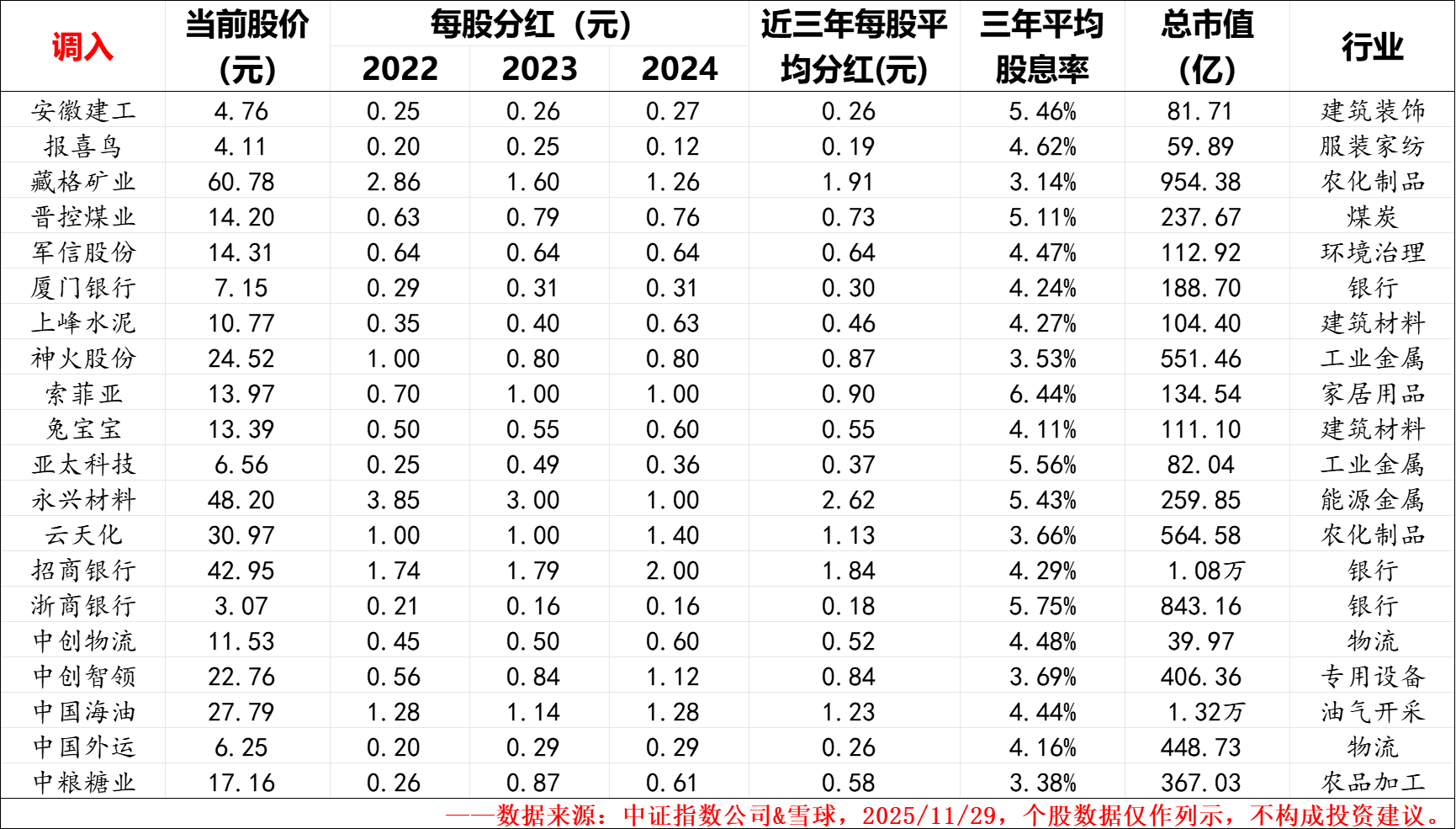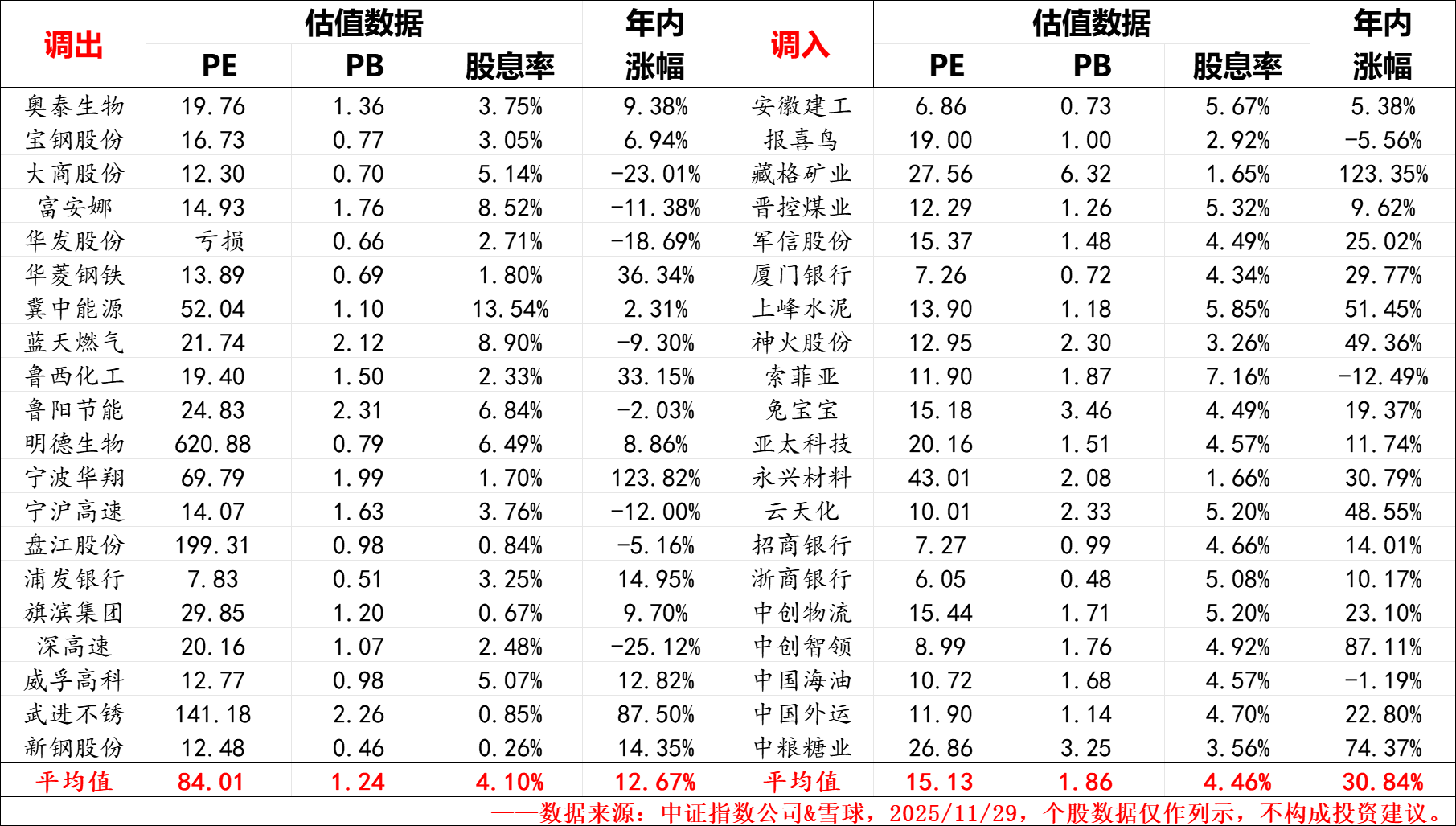 特别说明:1、数据来源于中证指数公司&雪球,2025/11/29,手工整理可能存在错漏,请自行甄别;
