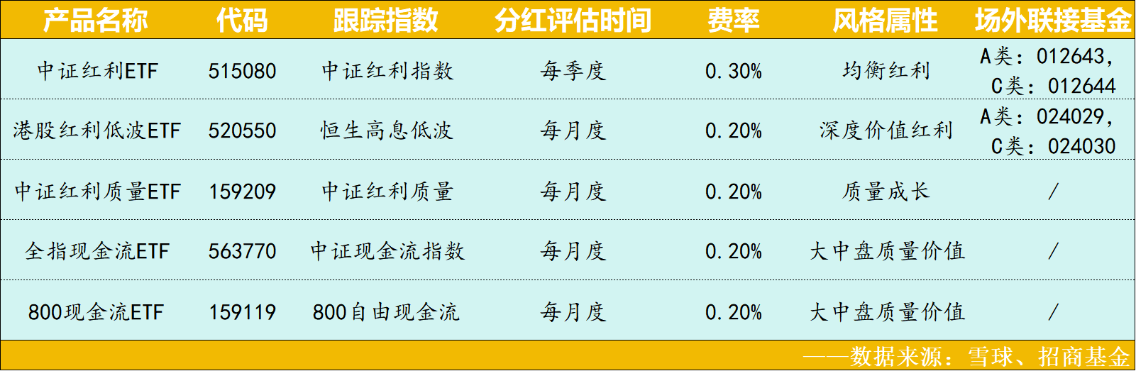 有意投资中证红利指数的朋友可以关注中证红利ETF(SH:515080),这是目前场内流动性最好、规模最大、管理水平最佳、费用率最低、分红最稳定的红利类ETF之一,没有股票账户的朋友也可以考虑场外的招商中证红利ETF联接A(012643)和招商中证红利ETF联接C(012644)~