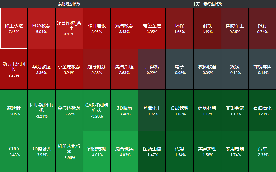 分行业来看,有色金属、环保、钢铁、国防军工、银行等行业领涨,汽车、家用电器、美容护理、传媒、医药生物等行业领跌。