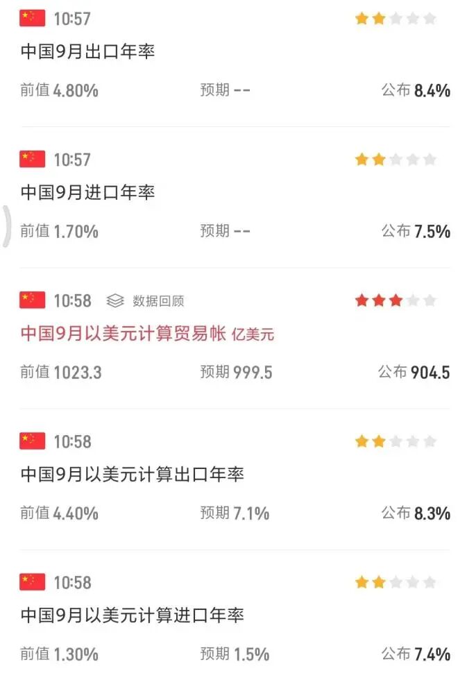 据海关数据,中国9月份以美元计价出口同比增长8.3%,高于预期的7.1%,基数大幅回落或为主要因素;进口同比增长7.4%,大幅高于预期的1.5%。一方面,原油、大豆等大宗商品进口跌幅显著收窄,分别较8月改善7.7和10.6个百分点,是拉动当月进口同比的最大因素;另一方面,资本品进口同比也大幅上行13.8个百分点至18.3%。