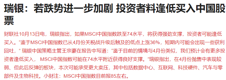 瑞银指出,如果MSCI中国指数跌至74水平,将获得强劲支撑,投资者可能逢低买入。