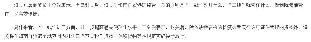 封关不是封岛,而是将海南岛全岛建成一个海关监管特殊区域,实施以“‘一线’放开、‘二线’管住、岛内自由”为基本特征的自由化便利化政策制度。
