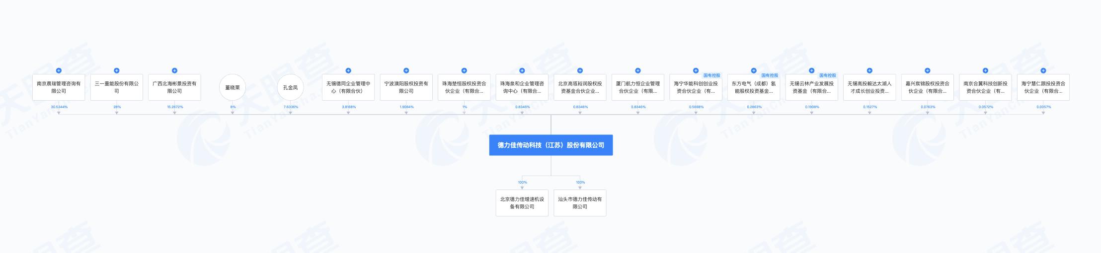 天眼查App信息显示,德力佳成立于2017年1月,位于江苏省无锡市,前身为北京德力佳传动科技有限公司。目前,该公司的注册资本为3.6亿元,法定代表人为刘建国,主要股东包括南京晨瑞、三一重能、彬景投资等。