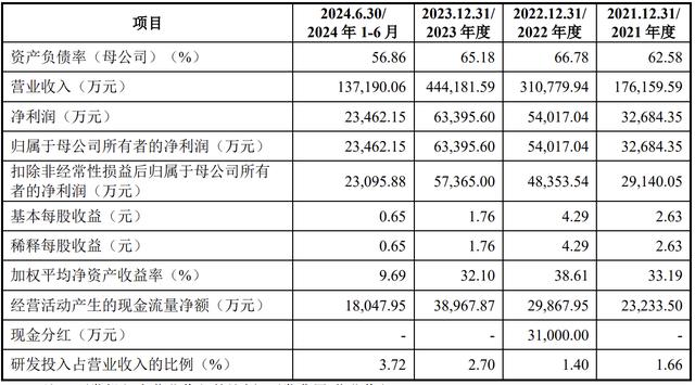 2021年、2022年、2023年度和2024年上半年,德力佳的营收分别约17.62亿元、31.08亿元、44.42亿元和13.72亿元,净利润分别约3.27亿元、5.40亿元、6.34亿元和2.35亿元,扣非后净利润分别约2.91亿元、4.84亿元、5.74亿元和2.31亿元。