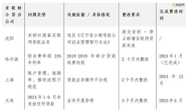 其中,2019年亚联财重庆分公司因违反地方条例及《合同法》被调查;2021年沈阳分公司收到金融服务局通知,表示其未报备互联网业务开展情况,违反了《辽宁省小额贷款公司试点管理暂行办法》。