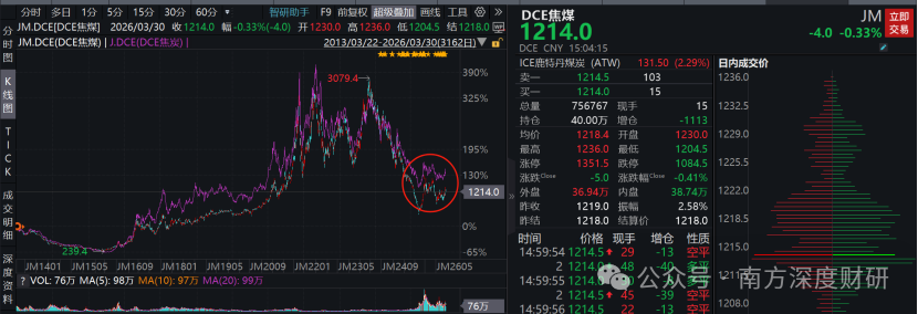 2025年5月曾跌至每吨726元的阶段低点。2026年3月30日,焦煤主力合约价格收于每吨1214元。