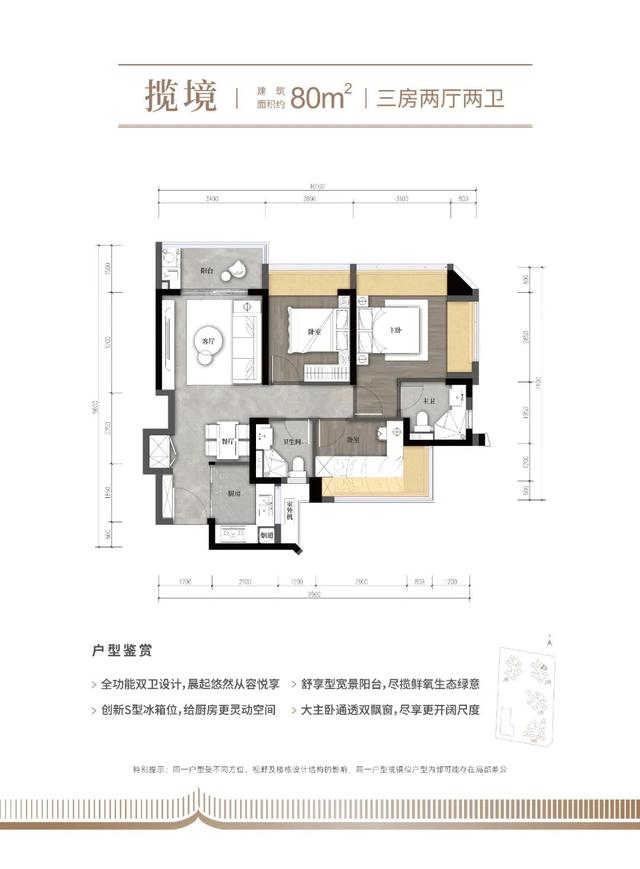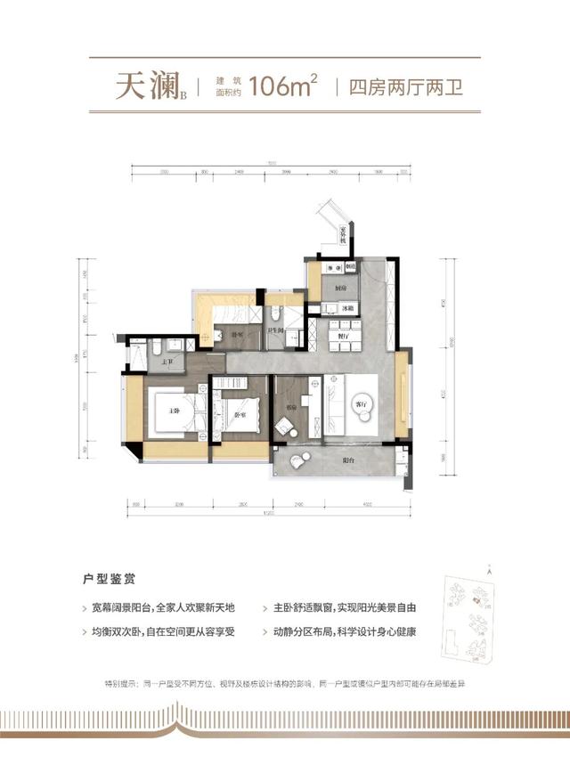 比如80㎡三房两厅两卫,全功能双卫设计,创新S型冰箱位,还有宽景阳台,主卧两个飘窗,次卧也摆得下1.5米的床,三代同堂也能住的舒服;106㎡四房两厅两卫更是能满足三代同堂,每个房间都不局促,连阳台都够摆休闲桌椅,动静分区的布局,彻底告别“居住空间挤得慌”的问题。