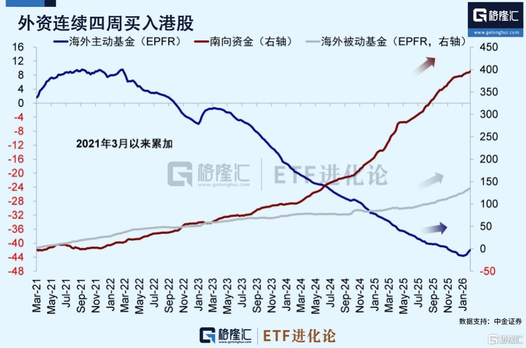 另一方面,港股自去年10月以来累计回调超18%,资金持续流入,上周外资和南向继续大幅流入港股市场。