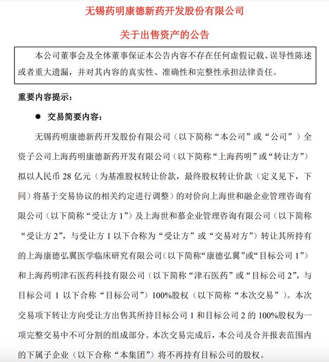 根据公告,药明康德全资子公司上海药明拟以28亿元的基准股权转让价款,向上海世和融企业管理咨询有限公司及上海世和慕企业管理咨询有限公司转让其所持有的上海康德弘翼医学临床研究有限公司和上海药明津石医药科技有限公司100%股权。