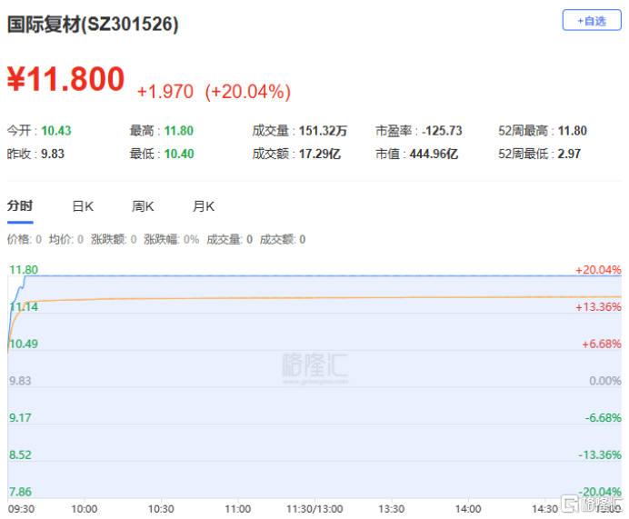 国际复材:今日涨停,全天换手率10.77%,成交额17.29亿元。机构净买入539.86万元,深股通净买入2015.52万元,营业部席位合计净买入3.99亿元。