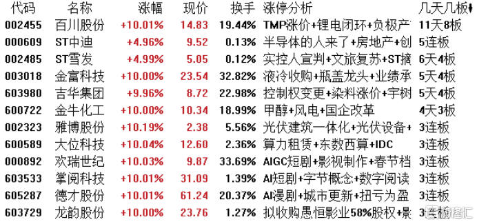 高位股方面,百川股份11天8板,ST中迪5连板,ST雪发6天4板,金富科技、吉华集团5天4板,金牛化工4天3板。