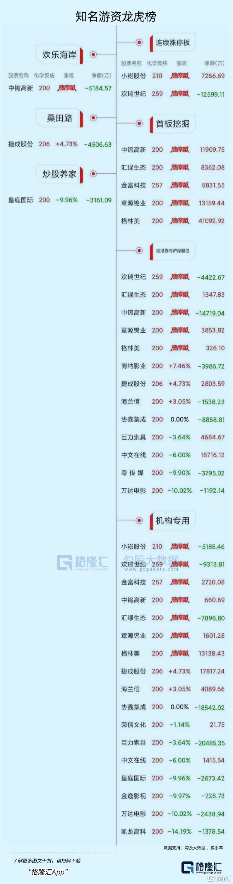 龙虎榜中涉及机构专用席位的个股中,当日净卖出额前三为协鑫集成、巨力索具、欢瑞世纪,分别为1.41亿元、1.37亿元、9313.81万元。