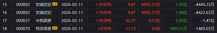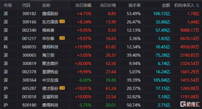 龙虎榜中涉及机构专用席位的个股中,当日净买入额前三为捷成股份、格林美、德邦科技,分别为1.78亿元、9088.17万元、4958万元。
