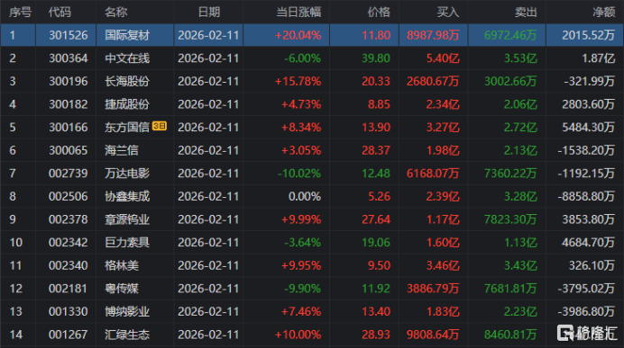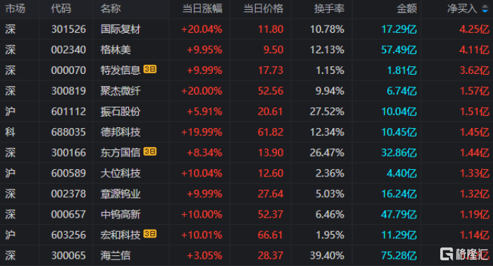龙虎榜单日净买入额前三为国际复材、格林美、聚杰微纤,分别为4.25亿元、4.11亿元、1.57亿元。