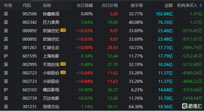 欢瑞世纪:今日涨停,全天换手率33.69%,成交额23.48亿元。机构净卖出9313.81万元,深股通净卖出4422.67万元,营业部席位合计净买入1137.37万元。