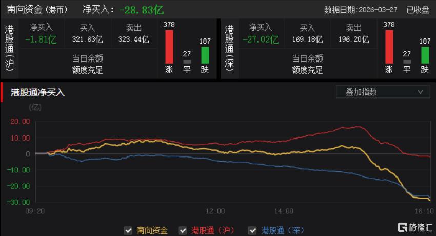 今日,南向资金净卖出28.83亿港元,其中港股通(沪)净卖出1.81亿港元,港股通(深)净卖出27.02亿港元。