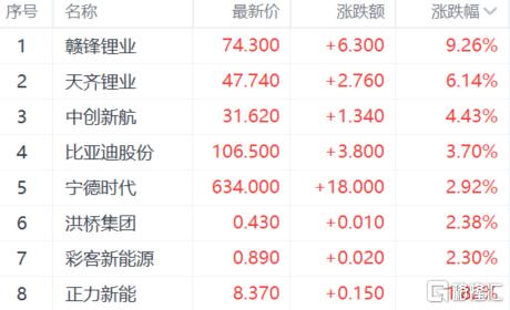 锂电池板块涨幅居前,赣锋锂业涨超9%,天齐锂业涨超6%,中创新航涨超4%,比亚迪股份涨超3%。