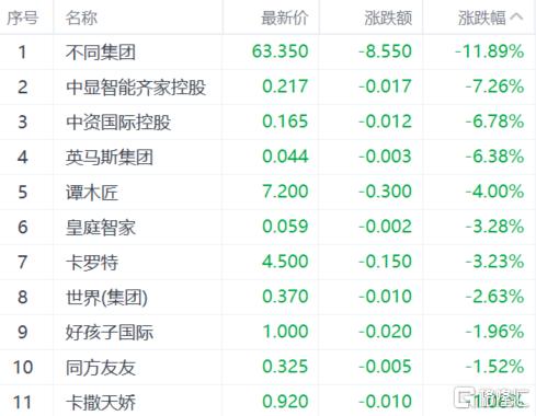家具板块走低,不同集团跌超11%,中显智能齐家控股跌超7%,中资国际控股、英马斯集团跌超6%。