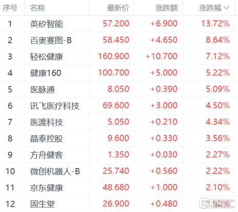 AI医疗概念股集体上涨,英矽智能涨超13%,百奥赛图涨超8%,轻松健康涨超7%,健康160、医脉通涨超5%。