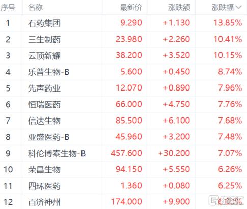 创新药概念股大涨,石药集团涨超13%,三生制药、云顶新耀涨超10%,乐普生物涨超8%。