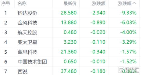 商业航天板块下跌,钧达股份跌超9%,金风科技跌超6%,航天控股跌4%,亚太卫星跌超3%。