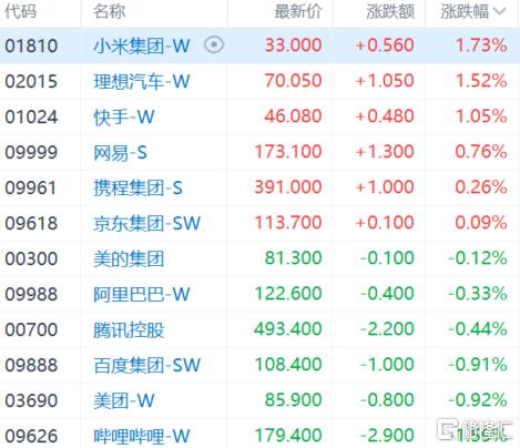 大型科技股涨跌各异,小米涨近2%,快手、网易小幅上涨,美团、百度、腾讯飘绿。