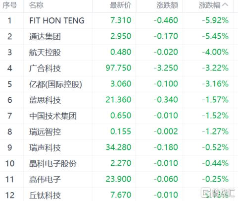 电子零件股跌幅居前,FIT HON TENG、通达集团跌超5%,广合科技、亿都(国际控股)跌超3%。