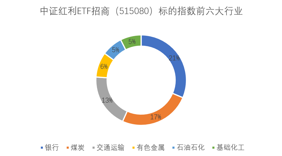 资料显示,中证红利ETF招商(515080)跟踪中证红利指数,前六大重仓行业分别为银行(21%)、煤炭(17%)、交通运输(13%)、有色金属(6%)、石油石化(5%)和基础化工(5%)——较为聚焦HALO资产,周期含量约四成。