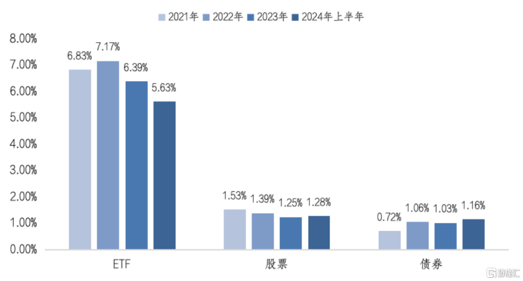 近年来,ETF因其交易性和工具性特征,受到市场资金青睐,推动国内ETF市场交投活跃度持续上升。2024年上半年,ETF日均换手率为5.63%,ETF整体流动性表现优于股票及债券市场。