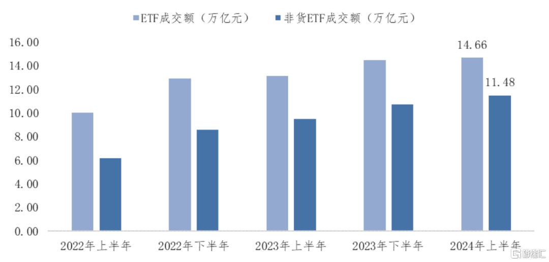 随着国内ETF产品不断扩容,投资者对ETF的接受及信任程度日益增强,交投活跃度持续提升。2024年上半年,国内ETF总成交额合计14.66万亿元,非货币ETF总成交额达11.48万亿元,均创历史半年度新高。