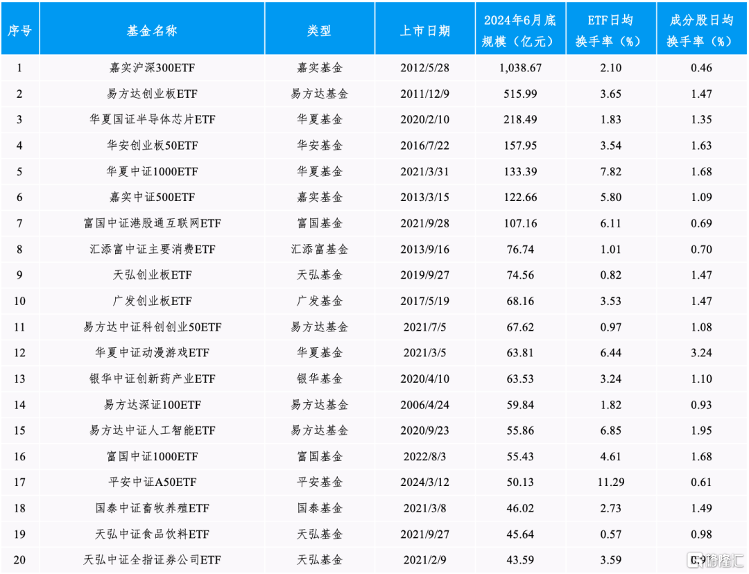 具体来看,多数ETF流动性高于其指数成份股流动性。截至2024年6月30日,深市规模前二十大股票ETF中,共有17只ETF日均换手率高于其指数成份股日均换手率,包括沪深300ETF、创业板ETF和芯片ETF等产品。