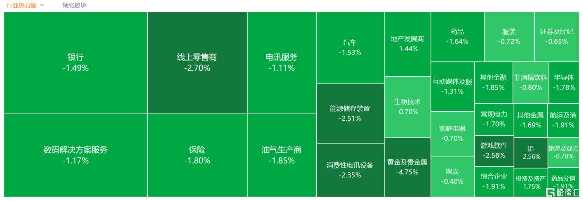 盘面上,大型科技股持续下跌拖累市场情绪,大金融股(银行、保险、券商)、中字头等权重股亦表现低迷,由此大市持续承压走低;小摩称金银面临巨量技术性抛压,黄金股领衔有色金属股回调;军工股、风电股、钢铁股、锂电池股、半导体芯片股纷纷下跌。另一方面,航空股、纸业股、脑机接口概念股少部分板块上涨,三大航空股全天活跃,均收涨超1%以上;此外,果下科技首日上市大涨近118%。