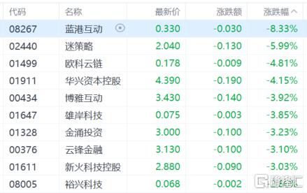 加密货币概念股走弱,蓝港互动跌超8%,华兴资本控股跌超4%,雄岸科技、云锋金融、新火科技控股等跟跌。
