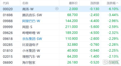 大型科技股持续下跌拖累市场情绪,商汤跌超6%,腾讯音乐跌超3%,阿里巴巴、网易、哔哩哔哩、京东等跌超2%。