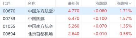 航空股逆市上涨,中国东方航空、中国国航、中国南方航空涨超1%,北京首都机场小幅上涨0.38%。