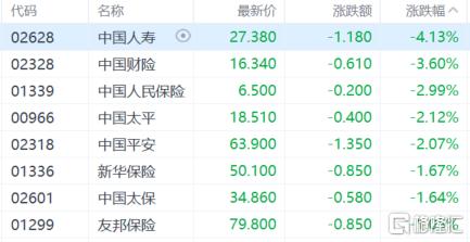 保险股走低,中国人寿跌超4%,中国财险跌超3%,中国人民保险、中国太平、中国平安跌超2%。