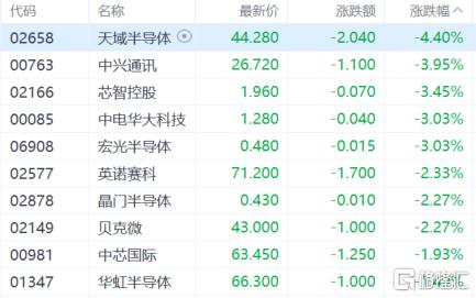 芯片股普跌,天域半导体跌超4%,中兴通讯、芯智控股、中电华大科技、宏光半导体跌超3%,英诺赛科、贝克微等跟跌。