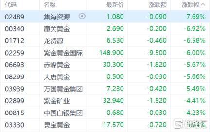 黄金及贵金属股大跌,集海资源跌超7%,潼关黄金、龙资源、紫金黄金国际跌超6%,赤峰黄金、大唐黄金跌超5%。
