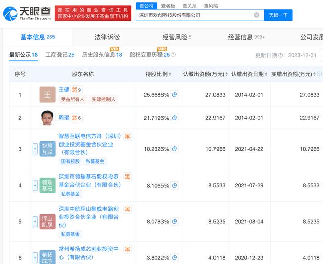据贝多财经了解,王健为欢创科技创始人,亦担任该公司执行董事、董事长兼联席总经理职务,周琨为执行董事、总经理。