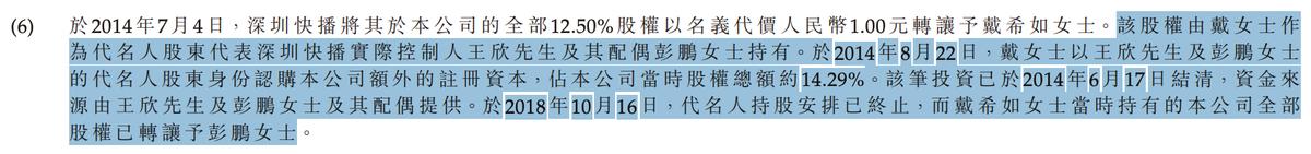 2014年7月,深圳快播将12.5%的股份以名义价格1元转让给戴希如。根据介绍,该股权由戴希如作为代名人股东代表深圳快播实际控制人王欣及其配偶彭鹏持有。
