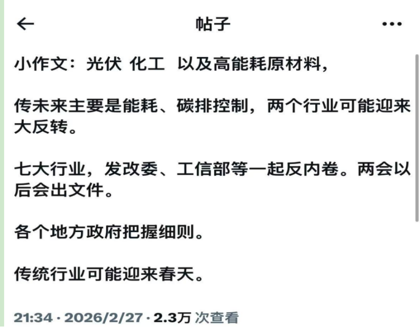 一方面是中央政治局会议明确加快全面绿色转型,更有小作文表示,未来产业调控将向能耗和碳排放控制倾斜,传统行业有望通过绿色转型迎来“春天”。