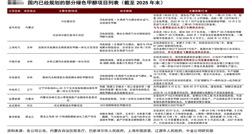 据券商研报,截至2025年末,国内绿色甲醇产能规划领先企业包括:远景能源(未上市)、金风科技(超200万吨)、中国天楹(100万吨电制甲醇)。