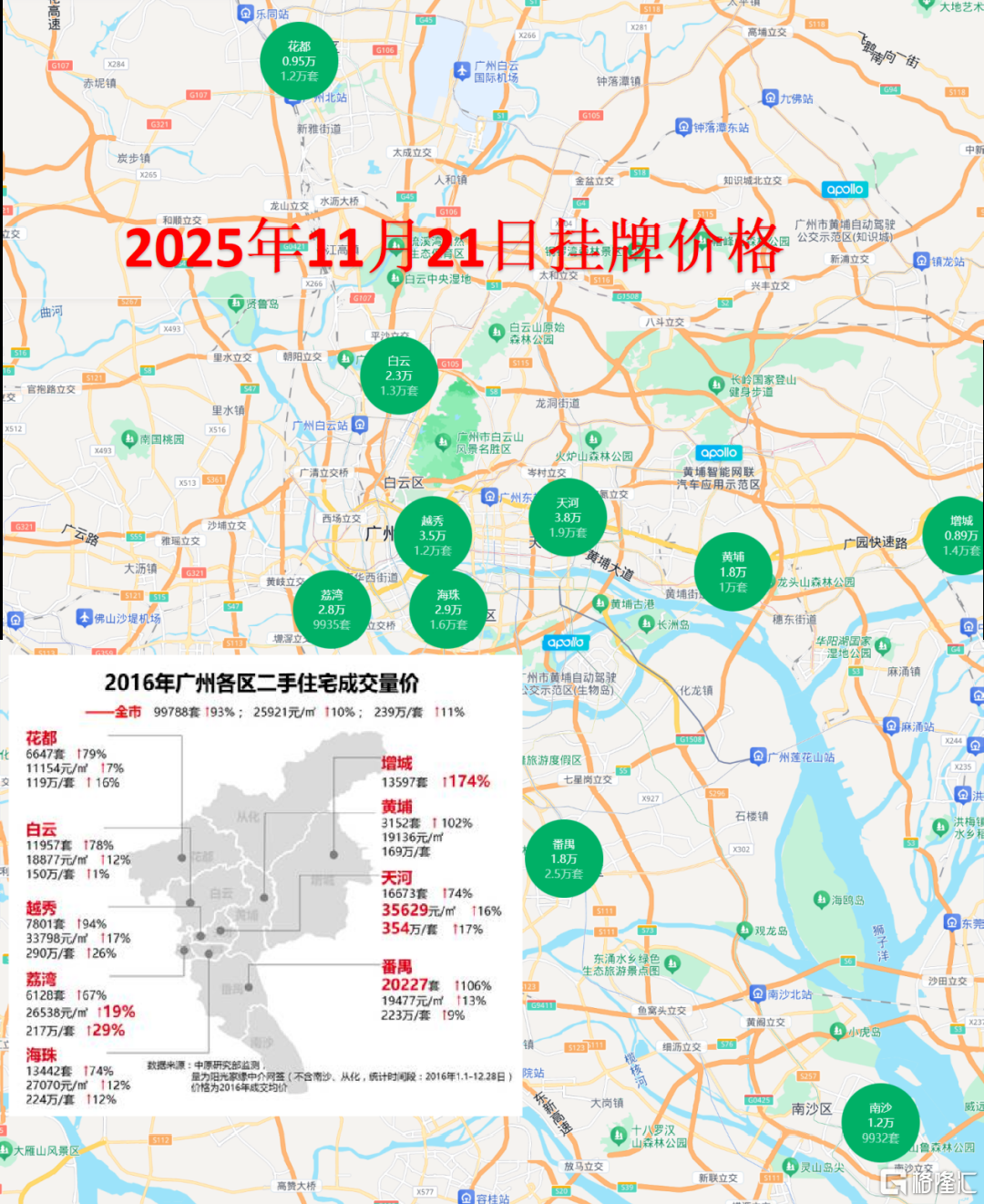 而从广州整体情况来看,很多房子已经回到不可思议的价格。2025年11月21日黄埔区、天河区、花都区、番禺区的挂盘均价已经比2016年的挂盘均价低了